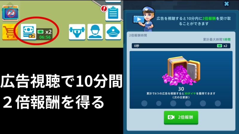 画面下部のアイコンをタップし広告を視聴することで入手できる報酬が10分間2倍になります。繰り返し広告を見ることで最大1時間まで延長可能です。広告の視聴前後で軍事ミッションなどの報酬を見比べたところ、きっちりと2倍にはならないようでした。それでも1.5倍程度にはなっているので広告を見て置いて損はないと言えます。