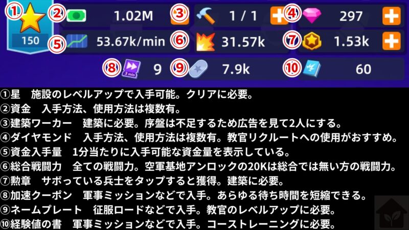 ゲーム画面のステータス部分の見方は上記画像の通りです。このゲームをクリアするには星、資金、戦闘力、勲章が必要になります。しかしそれらの数値を上げるためには他の項目も気にする必要があるので、ステータス画面の見方を押さえておくと安心です。