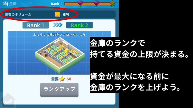 一見攻略とは関係なさそうな金庫のランクアップですが、このゲームでは必須となります。なぜなら金庫のランクを上げておかないと自分が持てる資金が上限に達してしまうからです。通常、この手のゲームは持てる資金の上限が決まっておらず、どんなに稼いでも無駄にはならないことが多いですが、このゲームは違います。金庫のランクを上げないと持てる資金の上限が低いままです。これを知らないと、どんなにオフラインで放置しようが上限を超えた分は入手できません。金庫のランクアップは必ず行うようにすることが重要です。