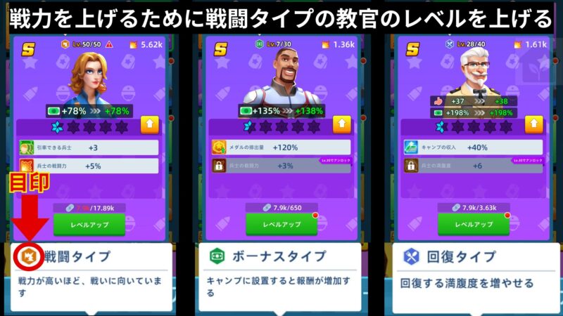 戦力を上げるために戦闘タイプの教官のレベルを上げる