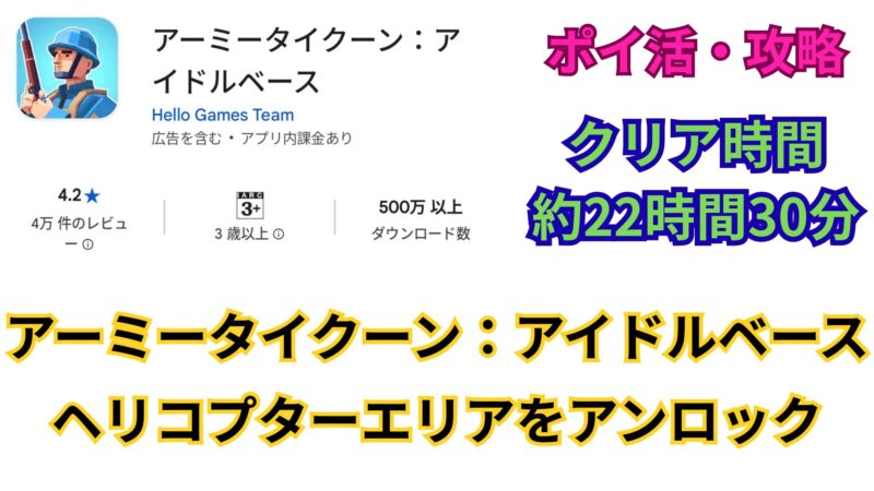 この記事では「アーミータイクーン:アイドルベース│ヘリコプターエリアをアンロック」の攻略法をお届けしました。このゲームは短期間クリアを目指す場合、広告を見るゲームだと割り切る覚悟が必要です。小さなキャラクターが細々と動くのは見ていて楽しいし、ゲームとしては楽しめるはずなんですが、ポイ活でやるには不向き。短期間クリアを目指す場合は広告地獄に陥るのでアンインストールした方がモチベーションは高まると思います。それでもプレイしようと思う方はこの記事の内容を参考に進めてみてください。