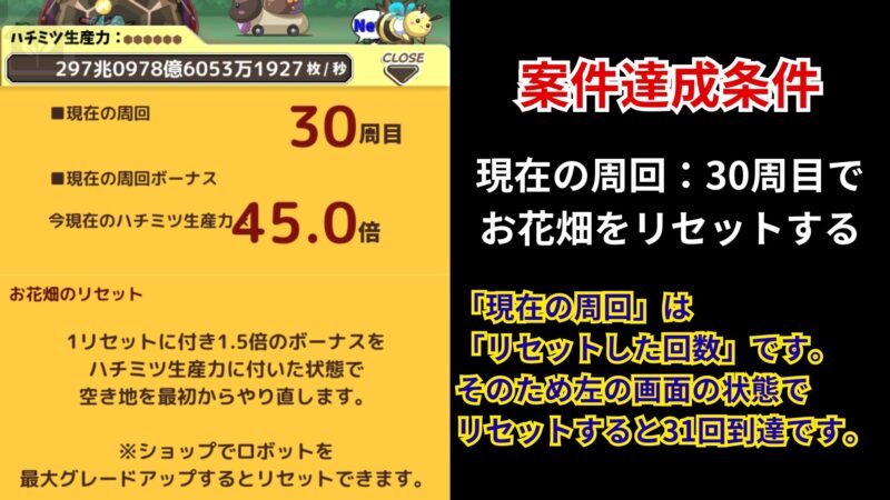 案件名:ハチミツコレクション お花畑のリセット数31回(周回数31)到達