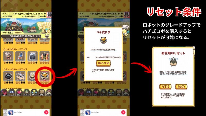 ショップにあるロボットのグレードアップでハチ式ロボを購入すれば、お花畑をリセットすることができます。ハチ式ロボを購入するには「育成でロボットを購入」してから「ロボットのグレードアップを順番に全て行う」ことが必要です。それ以外の要素(木や花の妖精、その他育成アイテムの購入)は購入しなくてもリセットできます。