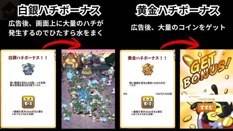 プレイ中に時々現れる「白銀ハチ」と「黄金ハチ」をタップして広告を見るとボーナスを得ることができます。白銀ハチはブーストがかかり画面上に大量のハチが出現。ブースト状態で画面を長押しして水をまき続けると通常時よりも早くハチミツを集めることができます。黄金ハチは広告を見るだけですぐに大量のコインをもらえます。短期間クリアを目指す場合はどちらも積極的に取得しておいて損はありません。