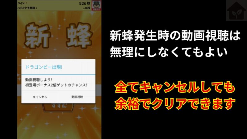 新しい蜂が発生したときに動画を見ると初登場ボーナスが2倍になります。ゲームを始めたばかりの頃は、その恩恵が大きいように感じますが、リセット回数を重ねるに連れて不要になります。筆者は1周目からキャンセルし続けていましたが、特に困ることはありませんでした。2倍の広告を見るぐらいなら、キャンセルしてゲーム画面に戻り白銀ハチや黄金ハチの広告を見た方が効率はいいです。