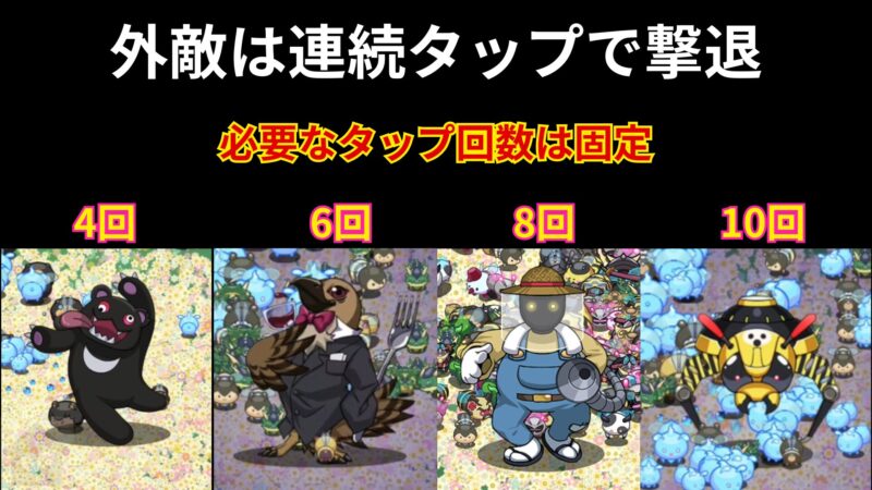 ゲーム中、一定の時間が経過すると現れる外敵はタップで追い払いましょう。外敵が出現したまま放置すると画面上のハチが全て消えてしまい、結果的に多くのコインを入手する機会を失います。必要なタップ回数は外敵ごとに固定されているので、疲れないように最小限のタップ回数を押さえておくと安心です。