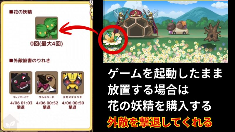 画面の左上にある花のアイコンで花の妖精を購入することができます。花の妖精はゲーム起動状態で放置したときに現れた外敵を自動的に撃退してくれる頼もしい味方です。もし放置する場合はハチがいなくならないように購入しておきましょう。