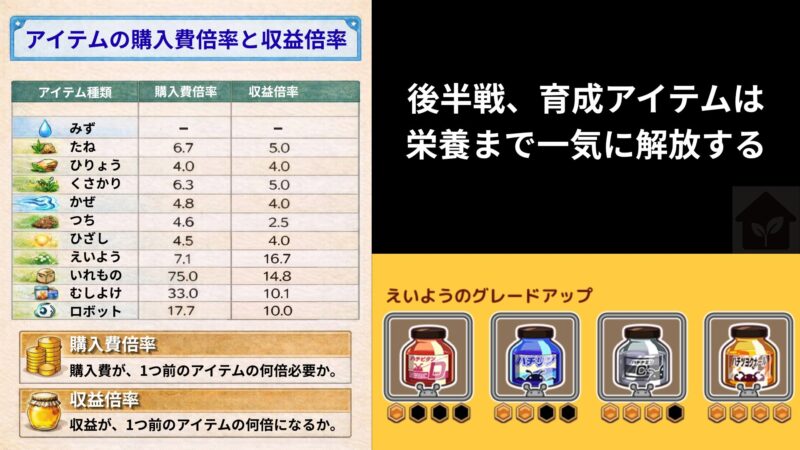 序盤は徐々に購入していくしかない育成アイテムですが、終盤になると一気に解放できるようになります。特に栄養は費用対効果が最も高いため、栄養までを一気に解放し、栄養の個数を増やしていくことが終盤攻略のコツです。栄養よりも収益の低いアイテムは積極的に購入する必要は無く、余ったコインで購入する程度でクリアできます。とは言え、収益の底上げは必要なので全育成アイテムの購入と1個で購入可能なグレードアップは行った方がよいでしょう。