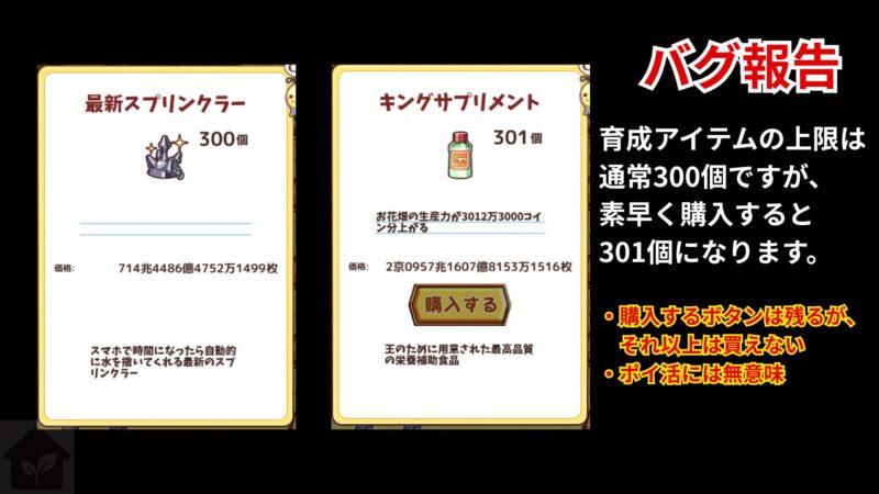 各育成アイテムは300個まで購入することができます。しかし購入速度を上げることで上限を超えて購入できる場合があります。299個まで購入後、300個目を購入する際に2タップするイメージで購入すると成功しやすくなります。ただし意味はありません。301個の画面に購入ボタンはありますが、必要額を貯めても押すのは無理です。ポイ活条件をクリアするだけなら、そこまで購入する必要もないので再現するだけ無駄と言えます。