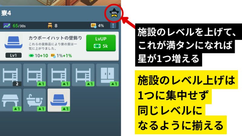 施設レベルを上げることで右上にある星の形のゲージが増えていき、満タンになると星を1つ入手できます。どの施設を上げてもゲージは増えますが、同じ施設に集中すると資金不足になるため、全ての施設を同じレベルにするイメージで上げていく方が進めやすいです。