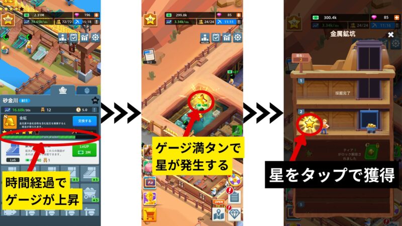 各採掘現場に表示されているゲージが満タンになると星が出現するので、採掘現場にある星をタップすれば鉱石のレベルが上がり星を1つ入手できます。ゲージは時間経過で溜めることが可能。オフラインでもゲージは増加するので、ある程度ゲームが進むとゲーム再開時に5個以上の星を入手することも可能です。