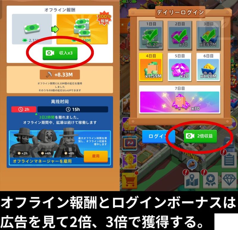 ログインボーナスやオフライン報酬は広告を見て2倍、3倍の報酬を得るようにしましょう。1分程度の広告で報酬が2倍、3倍になるため効率化につながります。ただしオフラインにした時間が極端に短く、広告を見ても大差ない場合は普通に受け取るという手もあります。