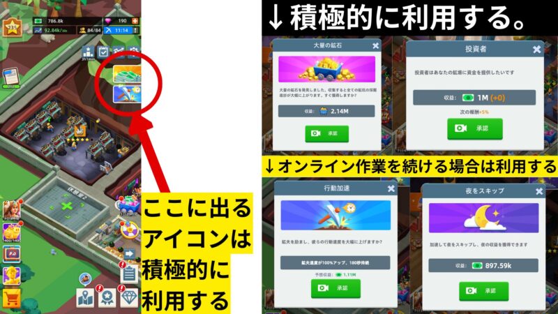 ゲームを進めていると画面の右上にアイコンが現れる場合があります。そのアイコンはタップして広告を見ることで様々なメリットを得ることができます。特に「投資者」は大量の資金を入手可能です。そして「大量の鉱石」は採掘を進めることができ、結果的に全体収益の増加につながります。「夜をスキップ」と「行動加速」はオンライン作業を続けるのであれば利用するのが得策です。