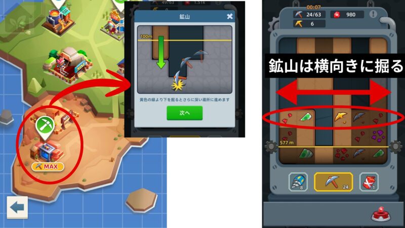 ツルハシを使って自分で穴を掘り進める鉱山でも資金を得ることができます。鉱山は穴が開いていると下に進んで行ってしまうため、入手したいアイテムがある場合は横に掘りましょう。ツルハシを使い切るまでにかなりの量の資金やダイヤを入手できるため、オフラインから復帰した際はツルハシを使い切るまでプレイしておいて損はありません。