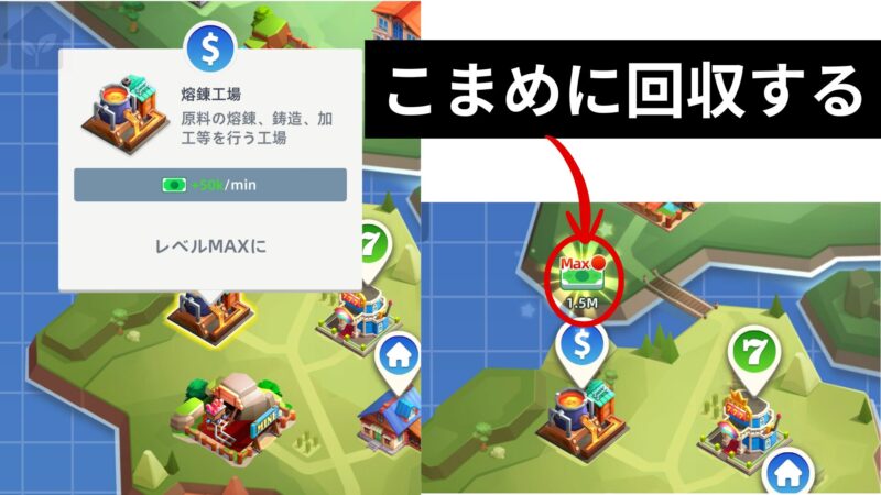 溶錬工場は自動的に資金を生み出してくれる施設です。影響力を増やすことで解放できるようになります。入手できる資金はあまり多くありませんが、こまめに入手することで効率を上げることが可能です。レベルを上げると入手できる資金が多くなるので上げておく価値はあります。