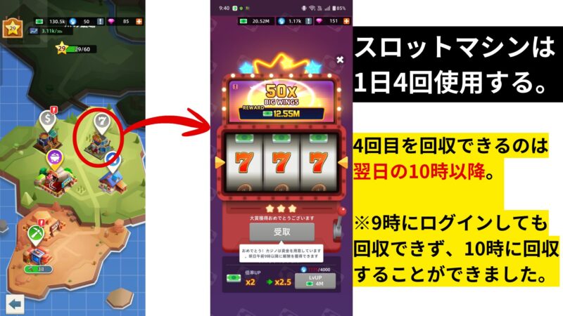スロットマシンは1日に4回使用可能です。最初の3回は揃った図柄に応じた倍率の資金をすぐにもらえます。私が回したときは最低でも2倍以上が当たっていました。そして4回目は必ず777が揃い大当たりになるのですが、受け取りは翌日の朝9時以降になります。しかし9時にログインしても受け取ることはできず、実際には10時に受け取ることができました。スロットマシンの解放には影響力を上げる必要があります。