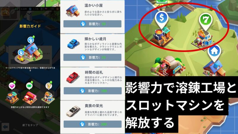 少しゲームを進めると住宅や車を購入することができます。これらを購入することで影響力が上がります。影響力を上げると特別な建物を解放できるようになるのですが、ポイ活条件をクリアする上では「溶錬工場」と「スロットマシン」のみ解放してください。川の鉱場周辺施設は解放不要です。