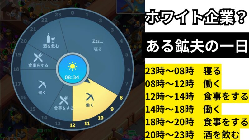 ゲーム中に鉱夫のタイムスケジュールが見れるのですが、あまりにも衝撃的だったので公開しておきます。いろいろとツッコミどころは多いのですが、夜に3時間お酒を飲んで、寝て、朝ごはん抜きで昼まで働くというのが一番驚きました。仕事終わりに2時間ご飯食べて、3時間お酒──しかも毎日ですからね。飯と酒のために働く。そしてきっちり9時間寝る。朝食抜きはどうかと思うけど、いい生活してるよなー。