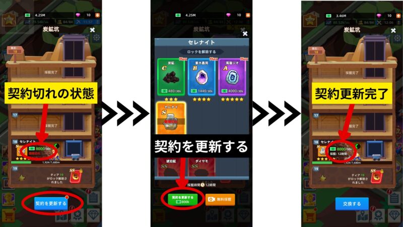 鉱夫との契約が切れると契約を更新するまで採掘が止まります。長時間放置する場合は採掘の残り時間に余裕があるか確認し、放置時間中に契約が切れそうな場合は放置する前に契約更新しておきましょう。