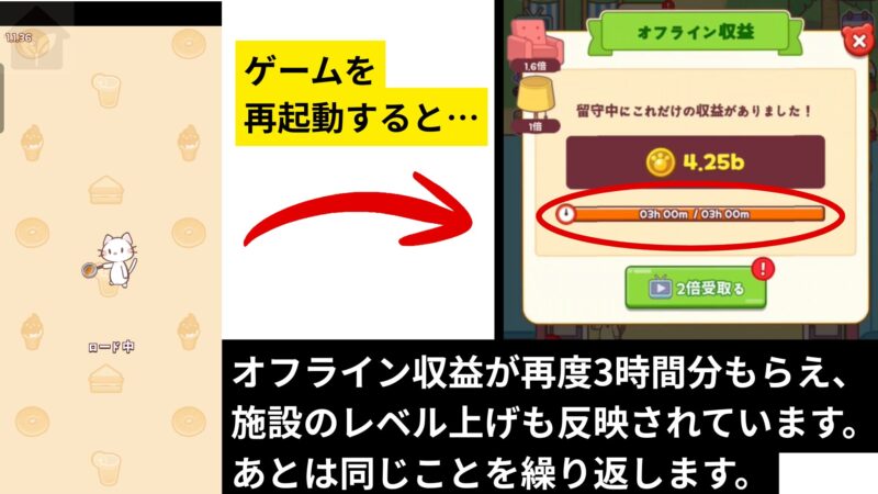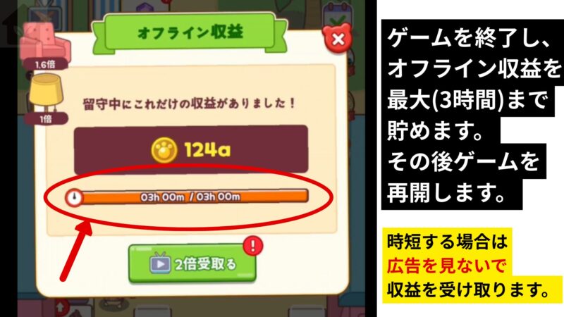 • ゲームを再開すると、オフライン収益が再度3時間分もらえる。