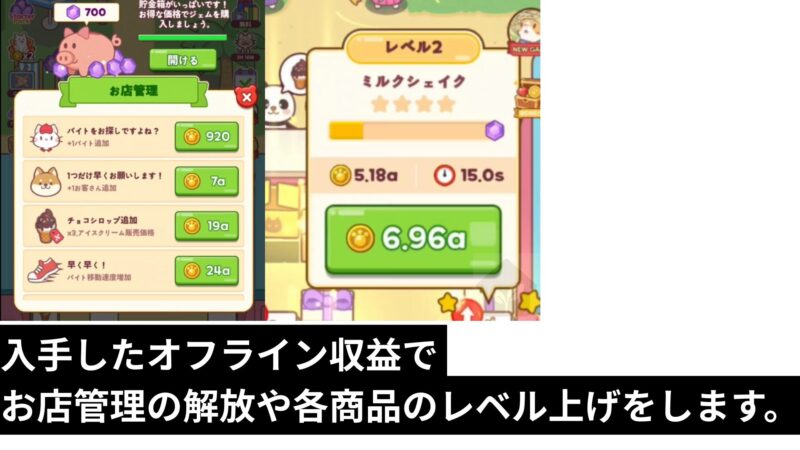 • オフライン収益を入手し、お店管理の解放や各商品のレベル上げをする。