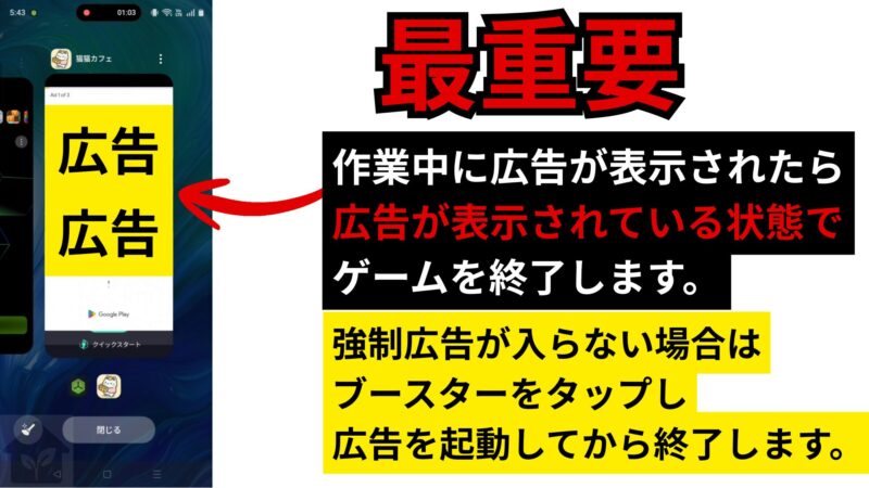 • 作業中に広告が表示されたら、広告表示中にゲームを終了する。