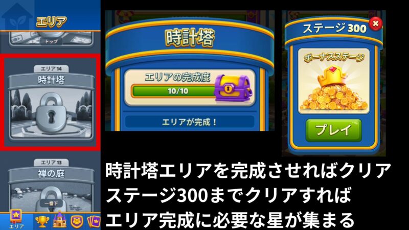 • ステージ300までクリアすれば時計塔エリアを完了できる