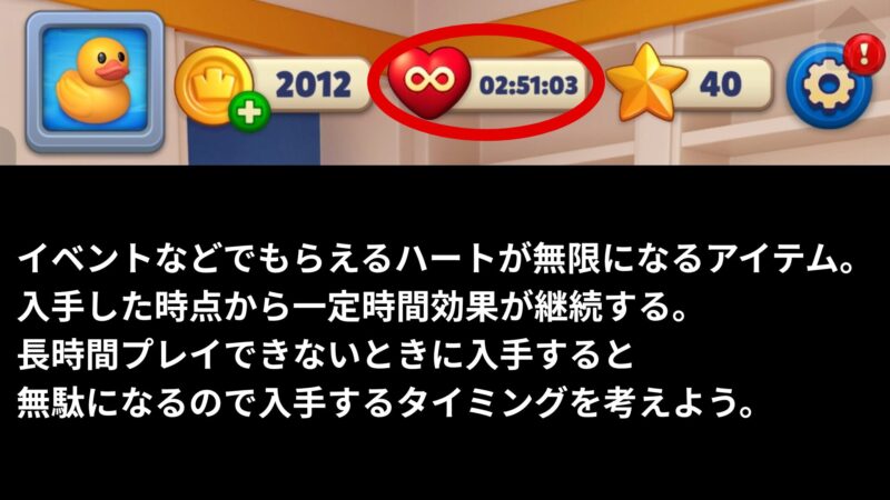 ゲームを進めるとイベントが解放され様々なアイテムが入手できるようになります。ハートが無限になるアイテムもその1つです。このアイテムは入手したときから効果を発揮します。自分で使うタイミングを選ぶことできません。そのため隙間時間などでプレイしていると効果時間が無駄になる可能性があります。何も考えずにプレイすると画像のように数時間ハートが無限になることもあるので、時間が無いときは入手直前でゲームをやめるなどして調整するのも一つの手です。