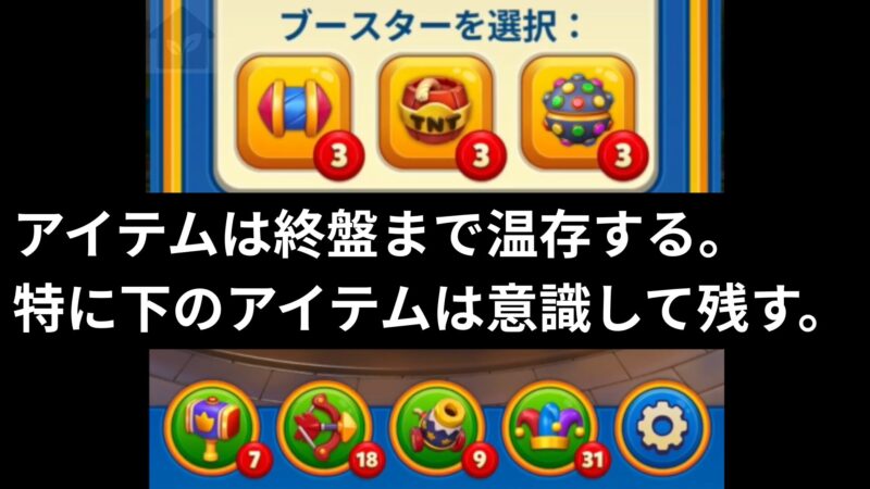 エリア完了などで入手できるアイテムには様々な効果があります。特にブロックを直接消去できるハンマーや弓矢、大砲は残りムーブ数が1になった状態からでも逆転できる可能性を秘めたアイテムです。入手できる数には限りがありますので、クリア条件が厳しくなる終盤ステージまで温存しておくと楽になります。