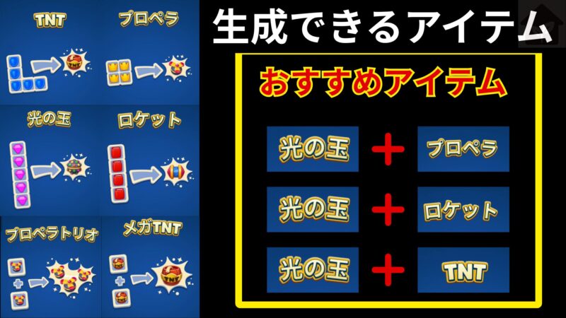 ブロックを特殊な形で消去することで生成可能なアイテムがあります。「ロケットは縦または横一列を消去する」「TNTは周囲のブロックを爆風で消去する」など効果は様々。上手く生成すると少ないムーブ数で大量のブロックを消去可能です。残りムーブ数が開始時から少ないステージでは、それらのアイテムを生成することが必須となります。特に「光の玉+プロペラ」は同じマスに複数飛ぶ場合もあるので、多くのステージで役立つ最強のアイテムと言えます。