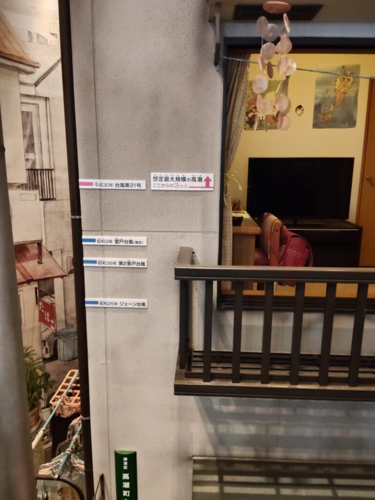 「水の都」とも呼ばれることのある大阪。土地は海面よりも低いところにあります。この展示では過去に発生した台風による高潮がどの程度の高さまで上昇したのかを確認することができました。